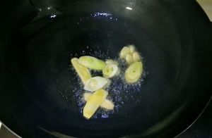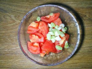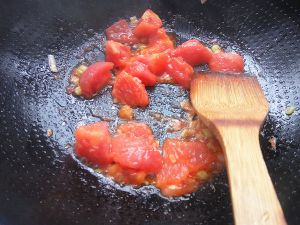 另起油锅,加入葱花炒香,将番茄加入炒出汤汁