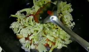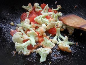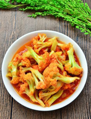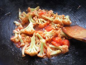 另起锅放薄薄一层底油,下入菜花翻炒,是菜花受热均匀后加入之前做好的番茄汁儿,颠炒均匀。