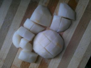 1小时后,把雪梨洗净,去皮,切成一小块一小块的,开盖放入炖盅,继续炖20分钟!