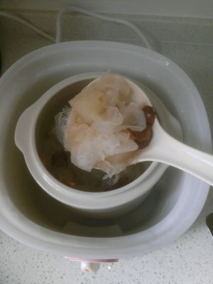 银耳泡半天,放入梨,红枣,枸杞,冰糖,高压锅小火熬一个小时