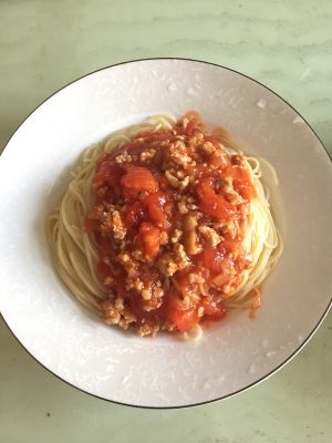 肉沫翻炒熟之后,放入西红柿丁翻炒出汁,在倒一小碗水,加番茄酱、盐、糖,煮十来分钟即可。