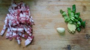 切适量肉,葱姜蒜,蒜切片,我的肉是切了两份菜的,放一起切了