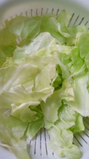 把圆白菜撕成片,叶片厚的部位不用,不易熟