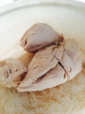 鸡胸肉白水煮熟。不要煮时间过长。如果掌握不好可以用剪刀剪开看中间是不是都变成白色。煮熟之后放入冰水里备用
