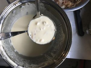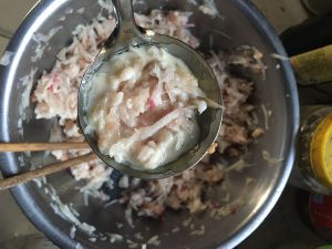 鸡蛋和面粉也加进去,搅拌一下,如果拌不开,加点水,不要全部加进去,一点一点的加