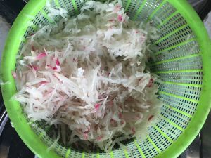 红皮萝卜切丝,撒少许盐腌10分钟,沥干水份