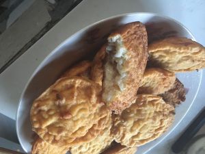 把饧好的面团用包包子的方法把包好的包子按成饼形煎好,OK了。