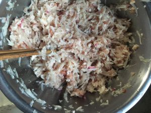 白萝卜,胡萝卜搽丝,可以放虾皮或猪肉馅,把辅料一起拌匀。面粉里放些盐和色拉油用温水和面,饧20分。