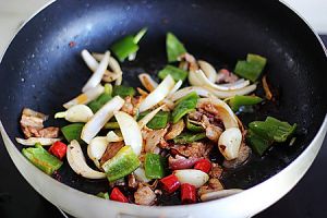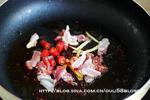 放红辣椒和干辣椒(辣椒的量随自己喜好),放入五花肉炒熟,