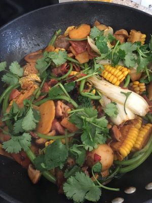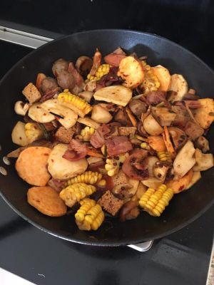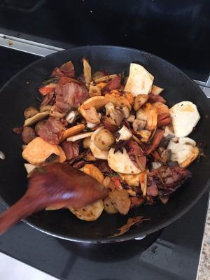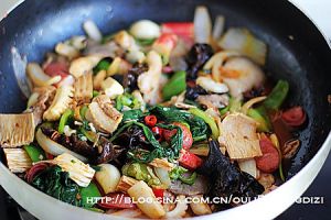 把土豆和胡萝卜还有菌类,海鲜最先倒入,翻炒一会倒入绿色蔬菜,最后是木耳等快熟菜。
