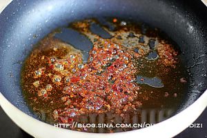 锅中放两勺油(和平时炒菜差不多就好),油烧热后,将剁碎的豆瓣酱下锅煸炒,炒出红油