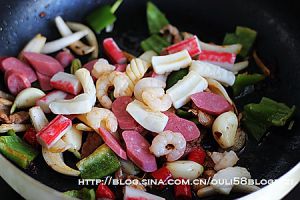 加入蟹柳、香肠和焯熟的鱿鱼卷和虾仁煸炒