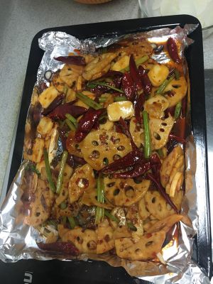鱼烤的过程中准备配菜,锅中热油放花椒辣椒小火炒至辣椒变成深红色加郫县豆瓣酱炒出红油,加生抽1勺提鲜,放入莲藕,年糕翻炒均匀,加水少量煮5分钟左右,出锅前加香芹菜翻炒,鱼烤20分钟把炒好的配菜填满鱼身和鱼边上的空隙再放烤箱烤10分钟就ok啦,撒上芝麻就可以开动啦