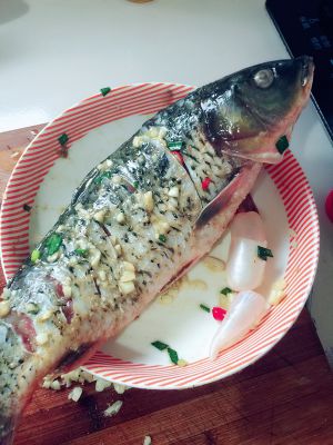 将鱼的外面划花刀,内外都抹上腌料,然后给鱼做个小按摩,让鱼肉充分吸收腌料的味道,按摩数分钟后将鱼静置30分钟,使鱼肉能够充分的入味