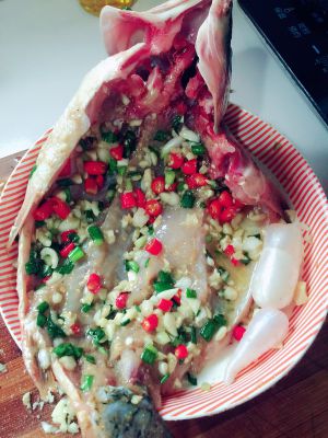 鱼从背部剖开洗净,从豆豆瓣酱开始的调料放碗里,调匀,涂抹到鱼身上,放冰箱里保鲜4小时