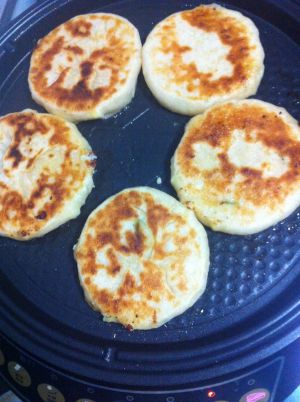 电饼饼预热,加入适量的油。用勺子舀面糊倒入锅中,摊成自己想要的大小,煎到两面金黄即可出锅。