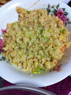 将虾仁剁碎同香菇粒,肉泥,卷心菜末一同加盐加胡椒粉,淋少许麻油搅拌均匀。