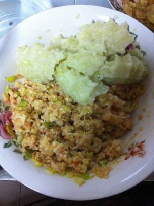 将土豆压成泥,加入洋葱碎、虾皮仁白拌匀。