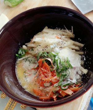 杀出的水倒掉,留一点,放面粉,葱花,鸡蛋