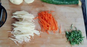 把土豆胡萝卜切丝,切适量的葱花,也可以放进去其他蔬菜