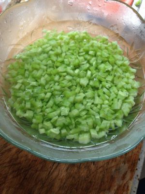 苦瓜切丁绰水,然后用冷水浸泡至苦瓜完全冷却,这样可以去除苦味