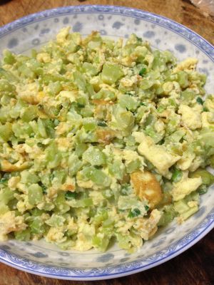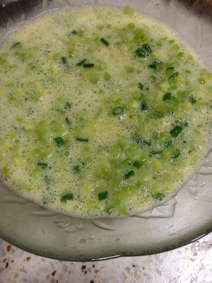 沥去冷水!葱切花,鸡蛋打散,和苦瓜搅拌