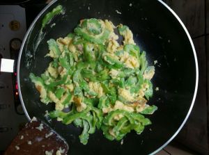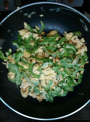 待蛋液凝固,苦瓜熟了微脆时,即可出锅了