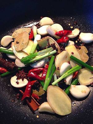 放少许油,放葱姜蒜,花椒,八角,桂皮,香叶爆出香味,再加2勺豆瓣酱炒香
