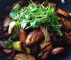 倒入煎好的鸡翅和土豆,加料酒,一点点盐和老抽,加糖,翻炒,差不多好了,再放洋葱和西芹,最后撒上香菜,大功告成,已经香得迫不及待啦