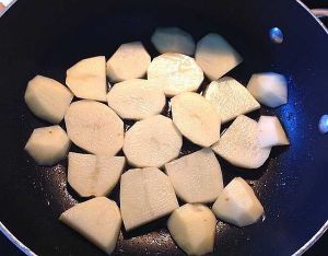 锅里剩余的油,煎土豆片,不要切太薄,0.5厘米