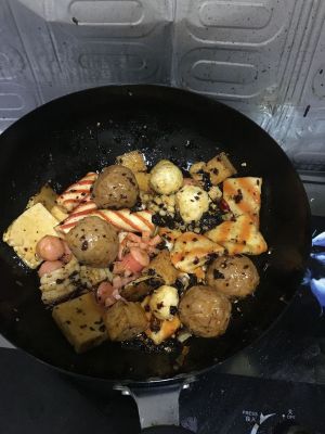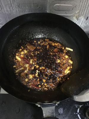 然后把之前煮好的菜啊肉啊什么的放进去炒,同时放郫县豆瓣酱,菜多的话就多放点要不然没有味道,菜少的话少放点因为那个酱很咸。