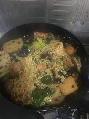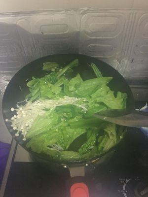 翻炒均匀后依次放入西兰花、菜花、香菇、藕片,翻炒均匀。如果怕糊锅,可适当放入少量的水。最后再放入青菜、金针菇和方便面,翻几下就可以出锅了!