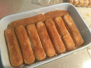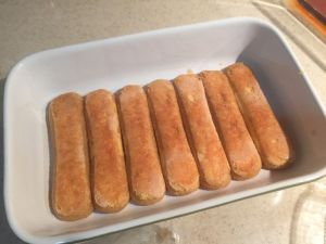 刚刚冷却着的咖啡液也凉到至少是手温一些了,用手指饼干沾满咖啡液,然后在容器底部放一层。