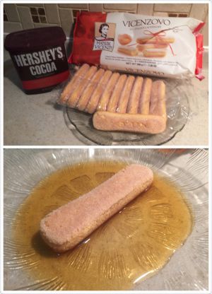 将手指饼干浸泡在咖啡混合液中,让两面吸收一些混合液,但注意不要浸泡过软。