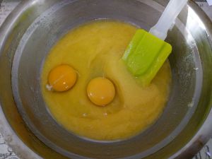融化后关火,拿出盆,放入小苏打搅拌均匀,打入鸡蛋搅拌均匀