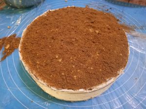 最后在外面全部抹上奶油,撒一层饼干碎。