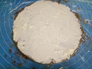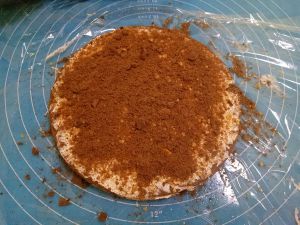 两大块保鲜膜交叉铺在平面上,饼干上抹一层奶油,撒一层饼干碎。 一块饼干,一层奶油,一层饼干碎,照这个顺序,八块饼干依次摞起来。