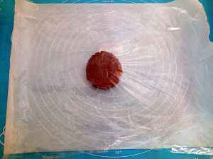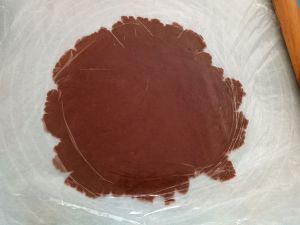 揪一块小剂子,放在硅油纸上,然后用手掌压开,压平。 用擀面杖特别麻烦,所以我直接用手压开的。