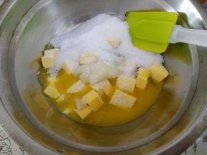 黄油,白砂糖,蜂蜜放入盆中,隔水加热融化,白砂糖比较难融化,要有耐心哦