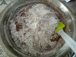 放入2克的小苏打,四分之一勺可可粉,十多勺低筋面粉,看面团状态添加面粉。