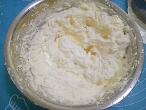 然后打淡奶油,雀巢淡奶油和打蛋头还有容器都需要提前冷藏,50克白糖分三次放,小档打至凝固状态。 具体打发方法:主页第一个菜谱,没有经验的小伙伴可以去看看~
