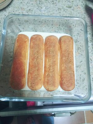 放上沾了咖啡和百利甜的混合体的手指饼,沾可以,也可以先铺到上面后用小勺浇上咖啡百利甜。然后继续铺奶酪混合体,看你容器的深度,来决定层数。基本上宜家买的玻璃烤箱容器能放两层饼。