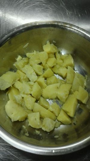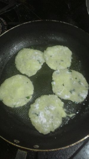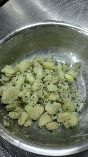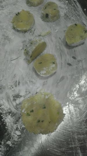 土豆电压力锅蒸八分钟,取出放到食品袋里压平,放入少许盐,一瓣蒜沫,拌匀,压成一个一个的小饼