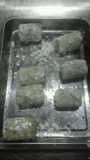 制作成圆柱型为下步煎饼做准备,外面撒点干粉不粘黏