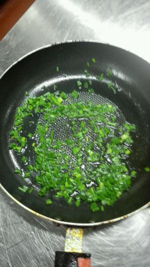 不粘锅小火烧热放少许猪油葱花一小把下锅煸炒出香味倒入放凉的土豆中
