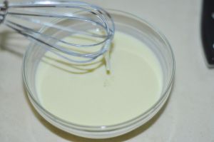 3.把鸡蛋跟奶油混合搅拌均匀,加入放凉了的牛奶里面搅拌均匀,(牛奶太烫的话会把鸡蛋烫熟,变蛋花)