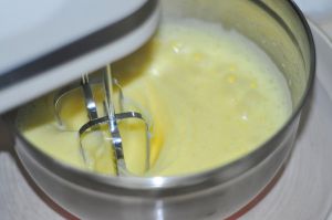 迅速倒入蛋黄液中,边倒边搅至均匀