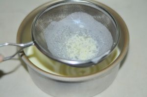 把搅好的布丁液过筛,倒入模具八分满,烤箱180度预热。