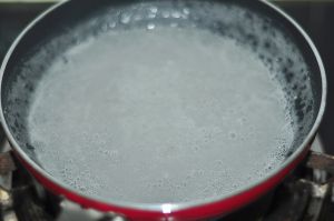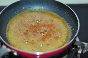 1.把90g的清水加入90g的白砂糖里,大火煮开。糖水起泡泡后转小火,偶尔转动一下锅,好让糖溶均匀,不要搅拌。糖水颜色会慢慢加深,看个人口味,喜欢甜的话,颜色变黄了就可以关火,喜欢苦的煮久点。好了之后趁热倒入容器里,不然糖水会变硬。