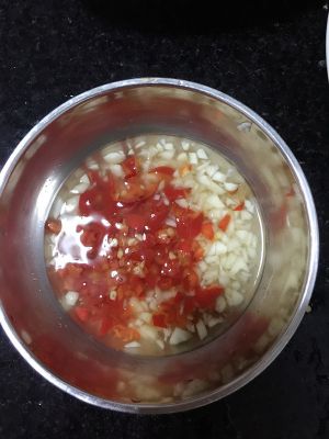 蒜瓣拍碎切成末,韭菜切成末!如果有葱花代替韭菜更好!家里没有葱花我就直接用的韭菜!味道也不错!
